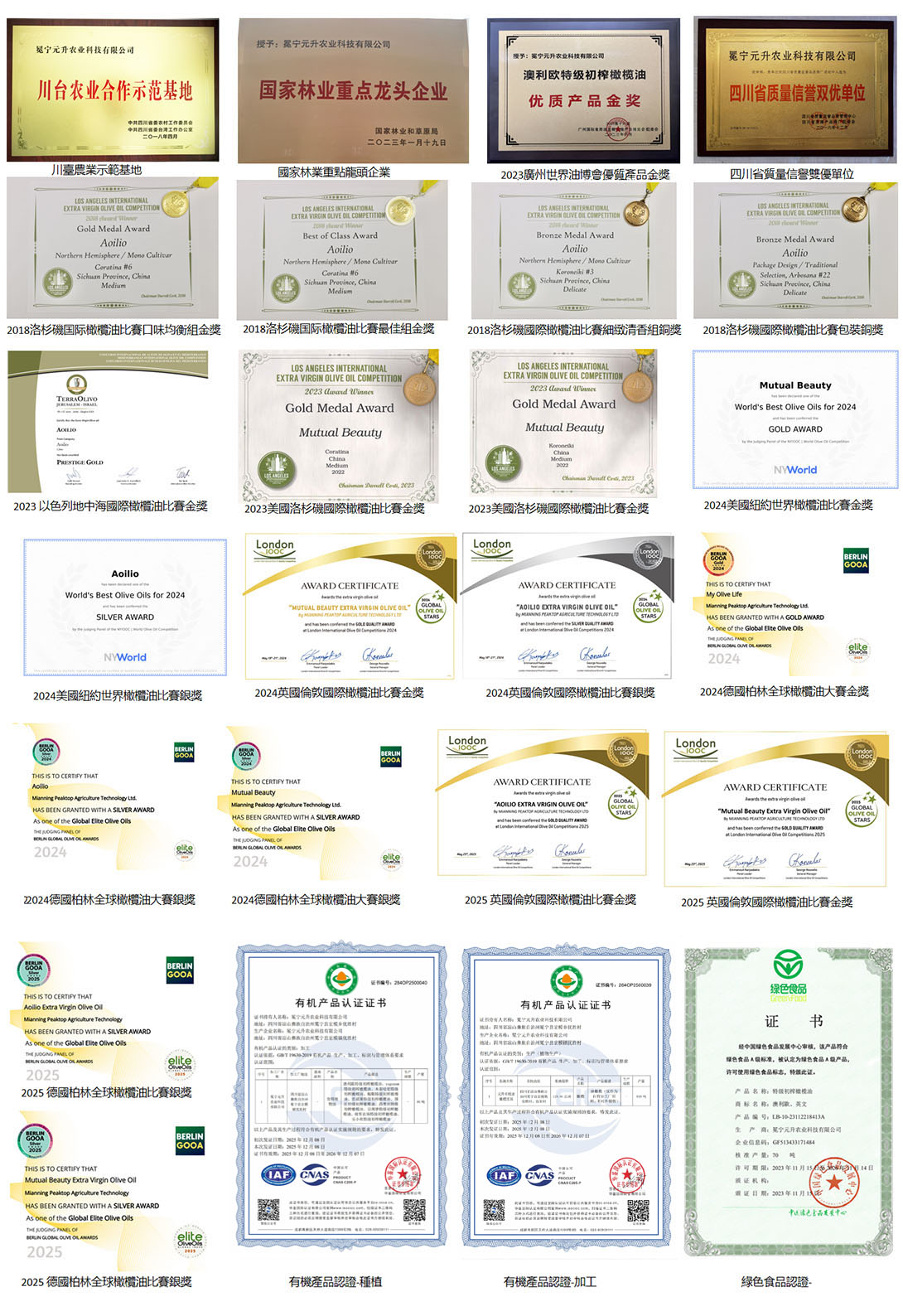 2016年“澳利歐特級初榨橄欖油”榮獲第十屆中國(廣州)國際食用油及橄欖油產業博覽會IOE世界油博會“優質產品金獎” 2017年“澳利歐特級初榨橄欖油”榮獲第十一屆中國(廣州)國際食用油及橄欖油產業博覽會組委會“優質產品金獎” 2018年“澳利歐特級初榨橄欖油”榮獲第十二屆廣州國際食用油及橄欖油產業博覽會組委會“優質產品金獎” 2019年“澳利歐特級初榨橄欖油”榮獲第十三屆廣州國際食用油及橄欖油產業博覽會組委會“優質產品金獎” 2020年“澳利歐特級初榨橄欖油”榮獲第十四屆廣州國際食用油及橄欖油產業博覽會組委會“優質產品金獎” 2021年“澳利歐特級初榨橄欖油”榮獲第十五屆廣州國際食用油及橄欖油產業博覽會組委會“優質產品金獎” 2023年“澳利歐特級初榨橄欖油”榮獲第十六屆廣州國際食用油及橄欖油產業博覽會組委會“優質產品金獎” 2018年“澳利歐特級初榨橄欖油”榮獲洛杉磯國際特級初榨橄欖油比賽,最佳組別獎金獎、口味均衡組別金獎、 細緻清香組別銅獎、包裝設計銅獎 2023年“澳利歐特級初榨橄欖油”榮獲以色列地中海國際橄欖油比賽金獎 2023年“木都哈尼特级初榨橄榄油”榮獲美國洛杉磯國際特級初榨橄欖油比賽金獎 2024年“木都哈尼特级初榨橄榄油”榮獲美國紐約世界橄欖油比賽金獎 2024年“澳利歐特級初榨橄欖油”榮獲美國紐約世界橄欖油比賽銀獎 2024年“木都哈尼特级初榨橄榄油”榮獲英國倫敦國際橄欖油比賽金獎 2024年“澳利歐特級初榨橄欖油”榮獲英國倫敦國際橄欖油比賽銀獎 2024年“橄榄人笙特級初榨橄欖油”榮獲德國柏林全球橄欖油大賽金獎 2024年“澳利歐特級初榨橄欖油”榮獲德國柏林全球橄欖油大賽銀獎 2024年“木都哈尼特級初榨橄欖油”榮獲德國柏林全球橄欖油大賽銀獎 2025年“澳利歐特級初榨橄欖油”榮獲英國倫敦國際橄欖油比賽金獎 2025年“木都哈尼特級初榨橄欖油”榮獲英國倫敦國際橄欖油比賽金獎 2025年“澳利歐特級初榨橄欖油”榮獲德國柏林全球橄欖油比賽銀獎 2025年“木都哈尼特級初榨橄欖油”榮獲德國柏林全球橄欖油比賽銀獎 發展歷程: